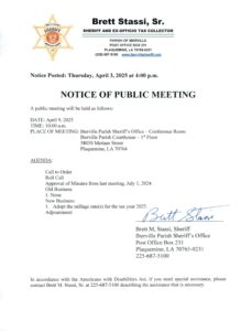 Notice is hereby given pursuant to Article 7, Section 23(C) of the Louisiana Constitution and R.S. 47:1705(B) that a public hearing of Iberville Parish Sheriff’s Office in Iberville Parish will be held in the Iberville Parish Sheriff’s Offic. . . .Read More